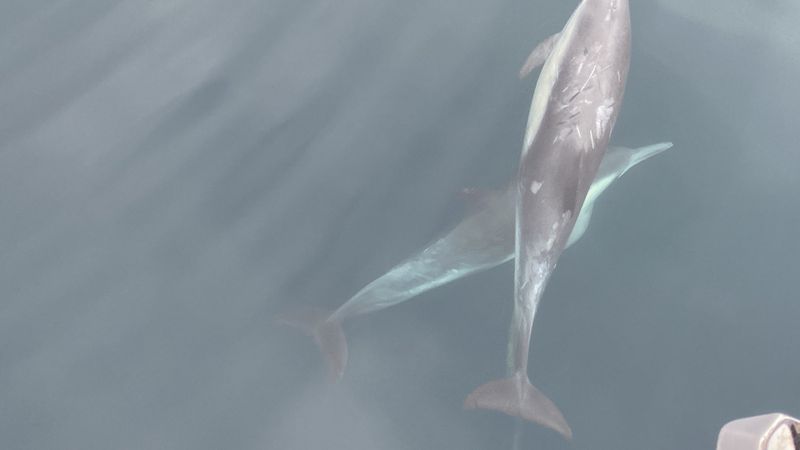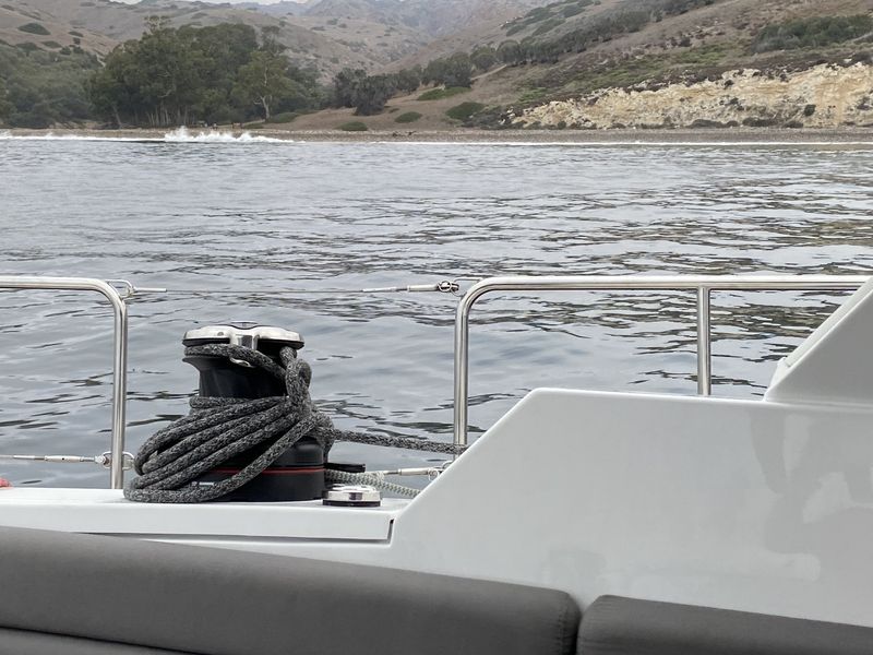 These are some photos of the dolphins that we saw on the way from Santa Cruz to Anacapa. We left Santa Cruz that morning and while our ultimate destination was channel harbor Marina, we stopped at Anacapa to go snorkeling. The snorkeling was amazing. We saw all sorts of fish and swam through a kelp forest. we even saw two rays. There were also a lot of caves. Though they were hard to get to because there was a lot of kelp blocking the entrances. However we managed to get into one of the caves and accidentally scared away a sea lion which terrified me. When we were finished snorkeling we got in the dinghy and tried to find a way into another one of the caves without sea lions. But we got caught right in the middle of a bait ball there were dolphins swimming around the dinghy everywhere and Pelicans dive bombing the water right next to us. We even caught some of the dolphins on the GoPro which we stuck underwater.