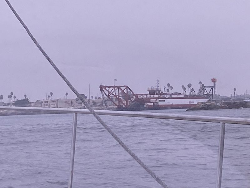 When we were done snorkeling, we headed a to Channel Islands harbor. The entrance was a bit scary because the waves we’re getting larger. So, we were scared about the waves and then all of a sudden, we saw this huge dredging machine that was pumping sand out off the bottom and onto the beach in in the entrance to the harbor. It was terrifying because there was a floating pipe going off half of it that was blocking off the path and the other side there was two smaller barges that were pulling the ropes to adjust where the dredging machine was. Once we were in the harbor we went to the dock where we would check in and get a slip assignment. Mamie, Holden, and Cora went to go walk up to where the harbor patrol would give them the slip assignment. But there was a sea lion in the way! The harbor patrol officer had to come and scare it away. Then we went to our slip and the boat was not rocking for the first time in 72 hours because while Santa Cruz and Anacapa were beautiful they we’re not great for anchoring at because they were not natural coves.